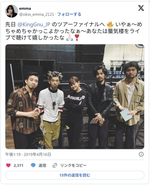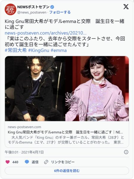 そんなemmaさんですが、結婚はまだしていません。2021年にKing Gnuの常田大希さんとの交際が報じられ、