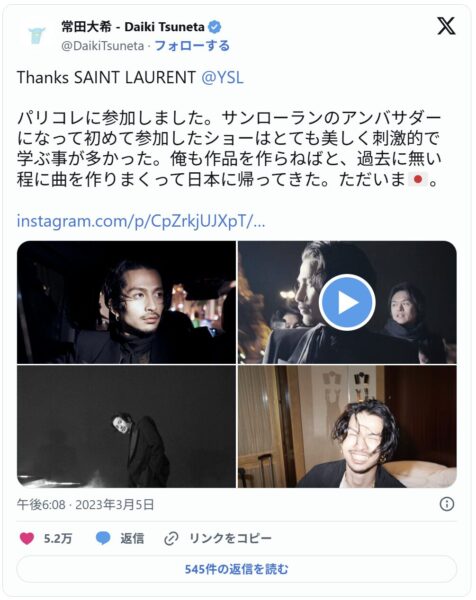 2023年にサンローランのアンバサダーに就任した常田さんは、3月上旬に行われたパリコレクションに参加されました。
